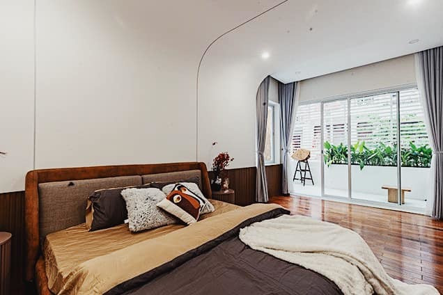 Sự thay đổi bất ngờ cho không gian nghỉ ngơi, thư giãn. Sàn gỗ cũ còn đẹp nên được anh Quý tận dụng. Cửa hành lang phòng ngủ master được mở rộng để lấy sáng.