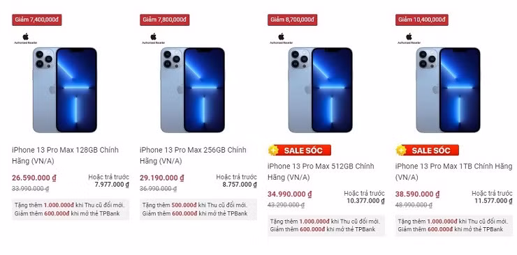 Cụ thể, iPhone 13 Pro Max giảm tới 10,4 triệu đồng, từ 48,9 triệu đồng xuống 38,5 triệu đồng đối với bản 1TB; giảm 8,7 triệu đồng xuống còn 34,9 triệu đồng đối với bản 512GB; giảm 7,8 triệu đồng xuống còn 29,1 triệu đồng đối với bản 256GB và giảm 7,4 triệu đồng, xuống 26,5 triệu đồng đối với bản 128GB.