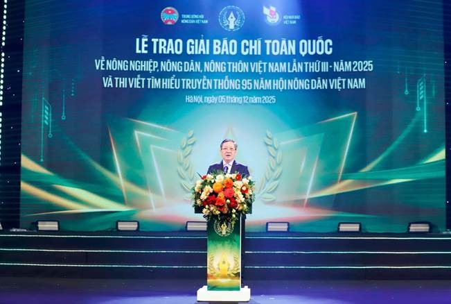 Đồng chí Lương Quốc Đoàn, Ủy viên Trung ương Đảng, Chủ tịch Trung ương Hội Nông dân Việt Nam phát biểu tại Lễ trao Giải báo chí toàn quốc về nông nghiệp, nông dân, nông thôn Việt Nam lần thứ III - năm 2025 tại Lễ trao giải được tổ chức ngày 5/12/2025. Ảnh: Lê Hiếu.