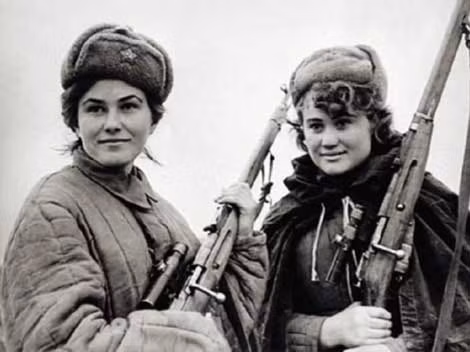 | Hai nữ xạ thủ bắn tỉa của Hồng quân cùng khẩu súng trường huyền thoại Mosin-Nagant. Ảnh: ABC.es. |