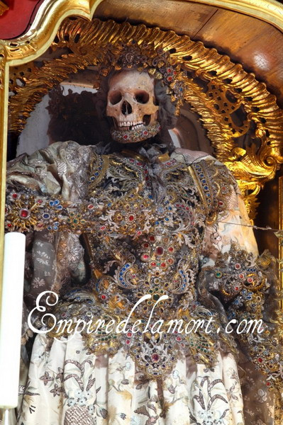 Đây là bộ xương duy nhất còn đầy đủ tại một hầm mộ ở Weyarn, Đức. Dòng chữ Latinh cho biết đây là một vị thánh tử đạo có tên là Valerius hoặc Valery. Ảnh: Empiredelamort.com.