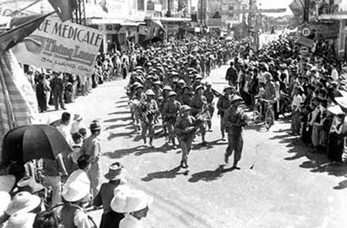 | Sau 9 năm trường kỳ kháng chiến, quân đội nhân dân Việt Nam đã làm nên chiến thắng Điện Biên Phủ chấn động địa cầu, buộc thực dân Pháp phải ký Hiệp định Genève (20/7/1954) công nhận độc lập, chủ quyền và toàn vẹn lãnh thổ của ba nước Việt Nam, Lào, Campuchia, đồng thời rút quân khỏi miền Bắc Việt Nam. Trong ảnh là lễ chào cờ cuối cùng của quân Pháp ở Hà Nội. |