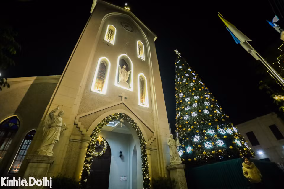 Cây thông noel cũng được dựng ngay trước cửa nhà thờ với đèn điện, dây kim tuyến...