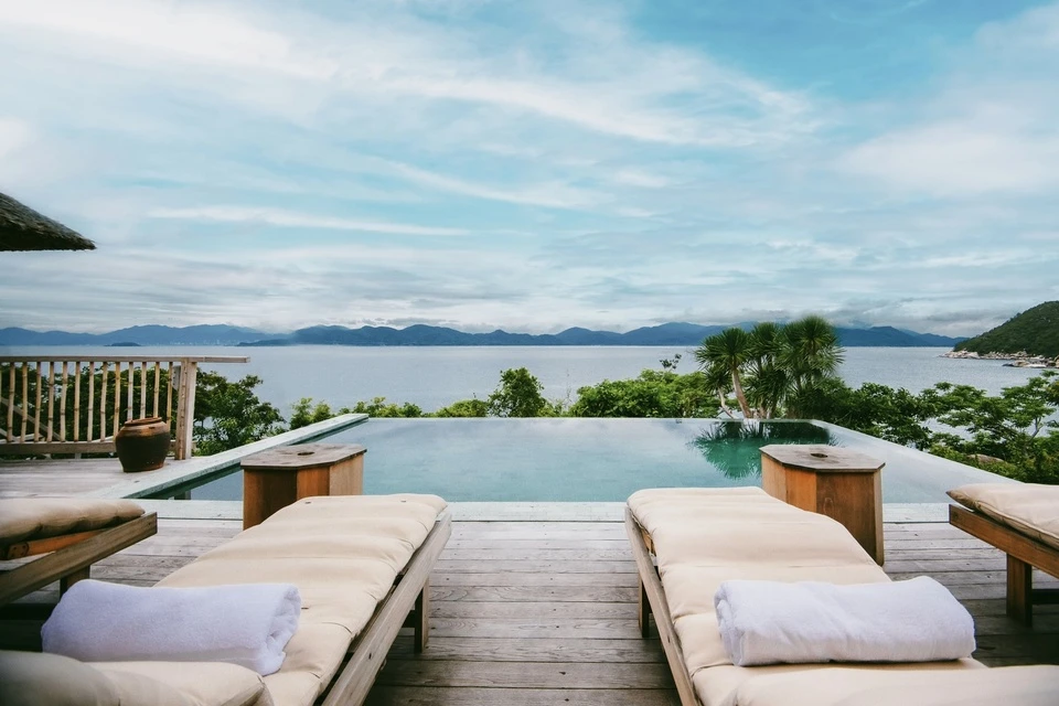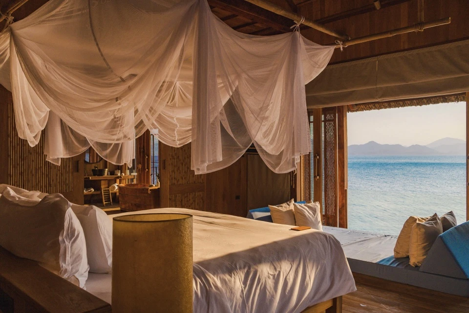 Điểm đặc trưng của khu nghỉ dưỡng là tất cả giường ngủ đều có tầm nhìn hướng biển. Phòng ngủ có không gian mở, phòng tắm, bồn tắm được làm bằng gỗ. Mỗi căn đều có lối đi, cầu thang riêng đảm bảo quyền riêng tư của khách. Ảnh: SSNVB.
