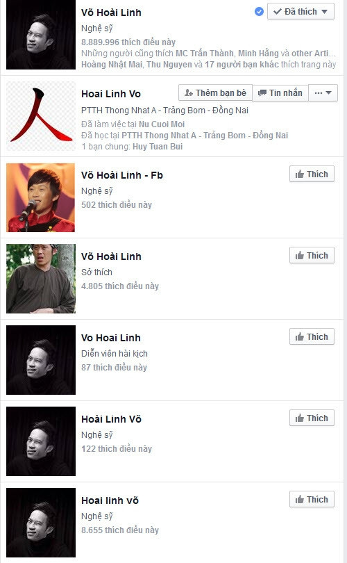 Ngoài ra, Hoài Linh cũng đăng hình ảnh một số trang Facebook Hoài Linh giả mạo có sử dụng ảnh của anh. Các trang này có khi còn chia sẻ clip riêng tư của Hoài Linh và thu hút khá đông lượt “thích”.