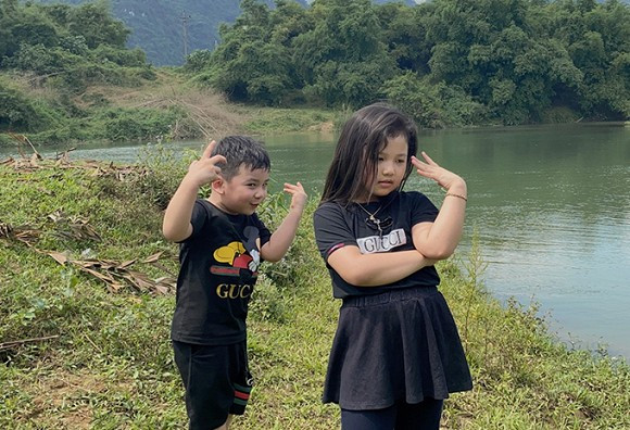 Hai nhóc tì nhà nàng hậu tỏ ra rất hào hứng khi được về Hòa Bình chơi cùng bố mẹ sau thời gian dài ở nhà tránh dịch. Bé Nấm - con gái út của cô - mới được vài tháng tuổi nên được gửi cho người nhà chăm sóc ở Hà Nội.