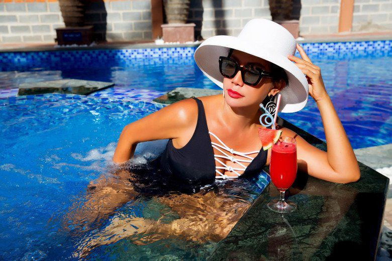 Có thể thấy, Kim Khánh rất thích những thiết kế xẻ sâu, khoe khéo vòng 1 căng đầy. Cô cũng thường mặc áo tắm đi biển song luôn khéo léo sử dụng áo khoác ngoài để tạo hình ảnh lấp ló, càng làm tăng thêm sự nổi bật, đằm thắm của mình.