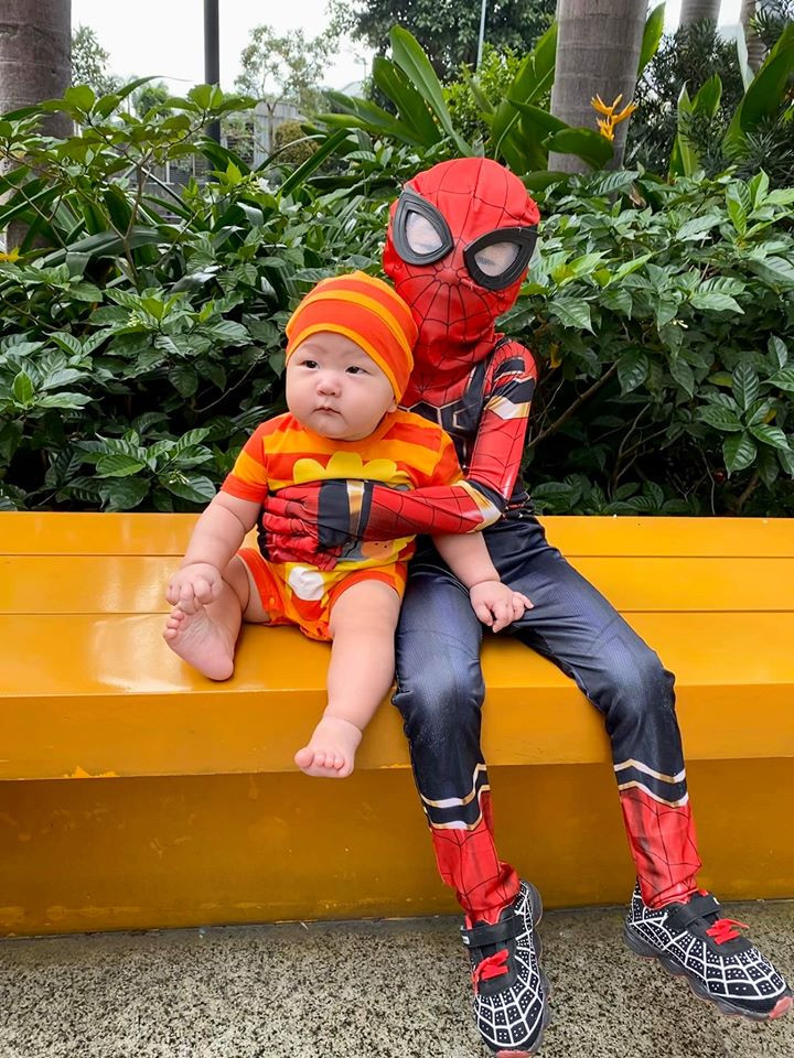 Đây là năm đầu tiên nhóc tỳ được đón Halloween nên cũng tỏ ra rất khoái chí. Theo tiết lộ của Trà My Idol, phải dụ dỗ bằng nhiều cách cu cậu mới chịu ngồi yên để mẹ tạo nét trên khuôn mặt. Ban đầu cũng tỏ ra khó chịu, nhưng khi nhìn thấy mọi người phấn khích với hình tượng của mình cậu cũng bẽn lẽn cười theo.