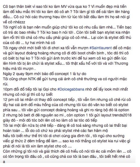 Tôi ngay chót mới biết tôi đi chơi xa tối vẫn mượn #Saintlaurent để cô mặc và gửi layout đoàng hoàng nhưng cô đi đôi boot chiến binh, tóc đó thì cô có biết bị hại? Tôi nói gửi ảnh trước khi để tui xem cô không gửi đến lúc lên hình tôi bị ăn chửi là stylist xấu... Tôi thật xấu hổ với tôi và với thương hiệu mà tôi mượn.