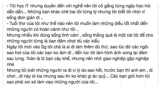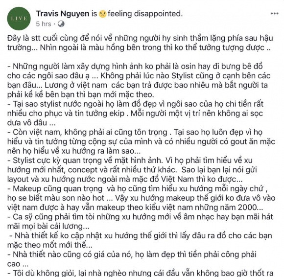 Mở đây, Travis Nguyễn chia sẻ: "Đây là status cuối cùng để nói về những người hy sinh thầm lặng phía sau hậu trường... Nhìn ngoài là màu hồng bên trong thì không thể tưởng tượng được. Những người làm xây dựng hình ảnh không phải là osin hay đi bưng bê đồ cho các ngôi sao đâu ạ ... Không phải lúc nào stylist cũng ở cạnh bên các bạn đâu... Lương ở Việt Nam, các bạn trả được bao nhiêu mà bắt người ta phải kề kề bên bạn thì bạn mới mặc theo.