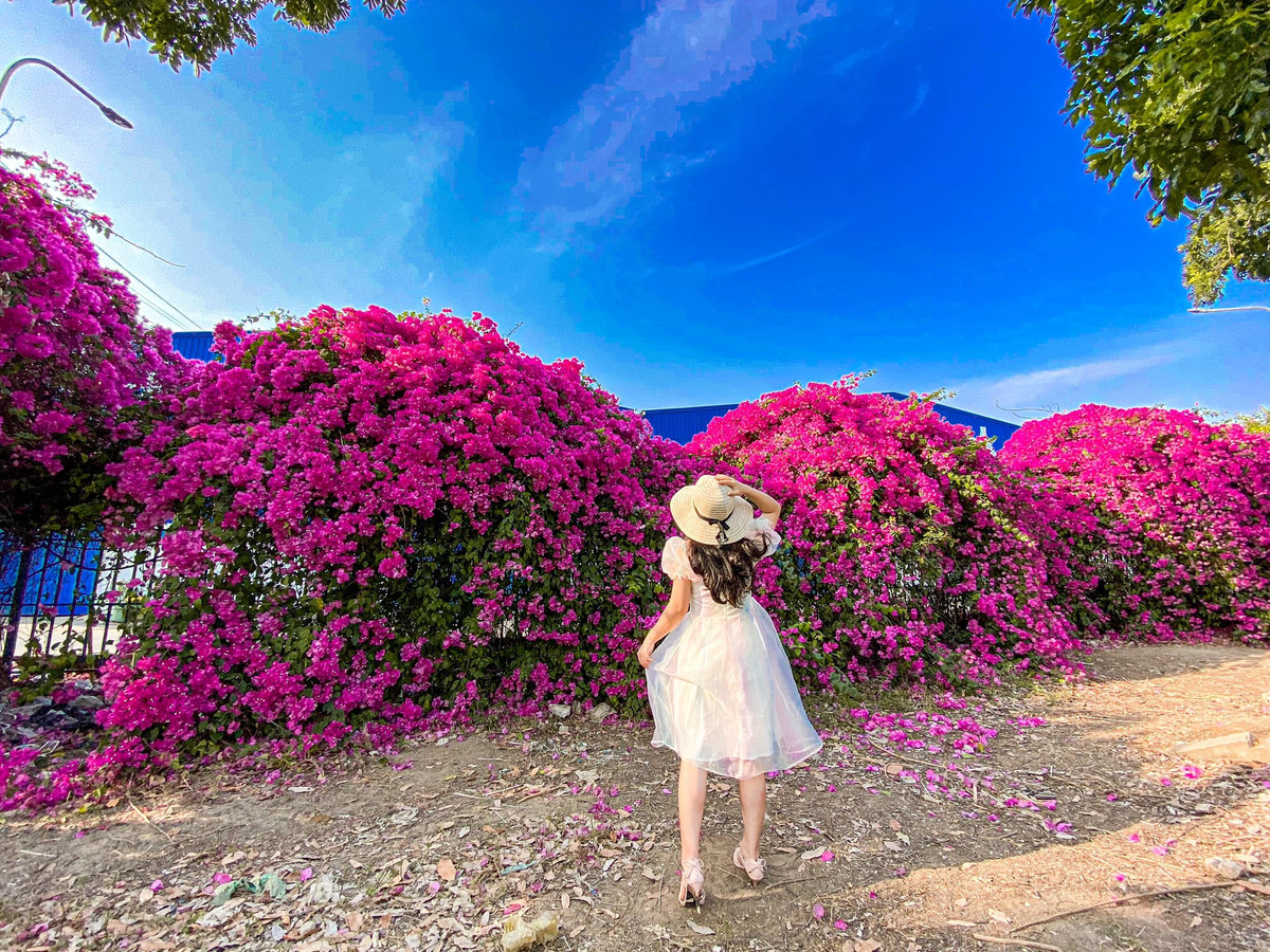 Con đường hoa giấy tuyệt đẹp này nằm tại khu công nghiệp Tân Kim, xã Tân Kim, huyện Cần Giuộc, tỉnh Long An. Nếu tính từ trung tâm Sài Gòn, nơi đây sẽ cách khoảng 18km, mất gần một tiếng đồng hồ chạy xe. Ảnh: Nguyễn Thị Cẩm Tiên