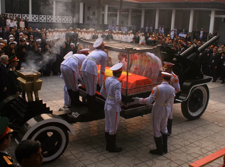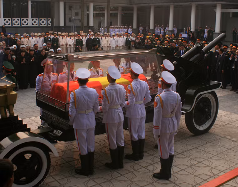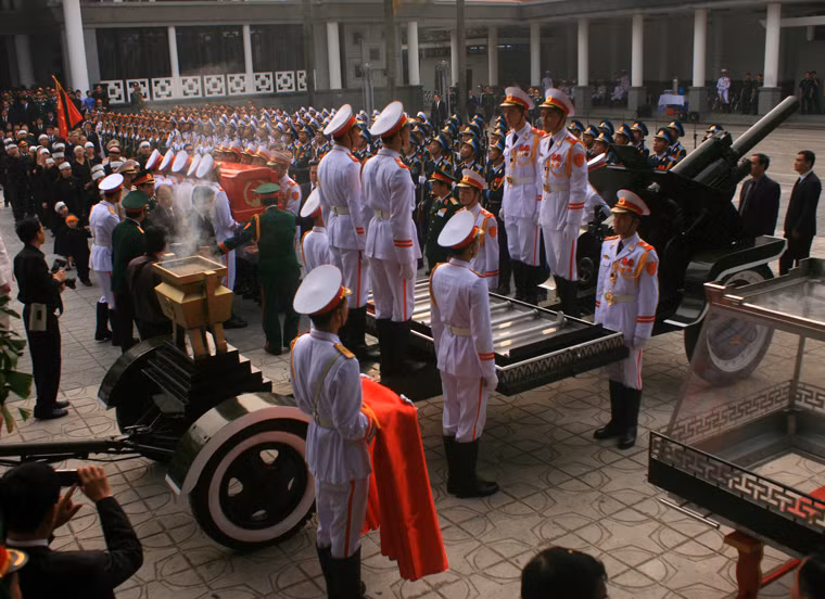 (Kiến Thức) - Lúc 7h30 sáng nay (13/10), lễ di quan Đại tướng Võ Nguyên Giáp bắt đầu. 12 chiến sĩ kính cẩn nghiêng mình tống linh cữu Người tới linh xa...