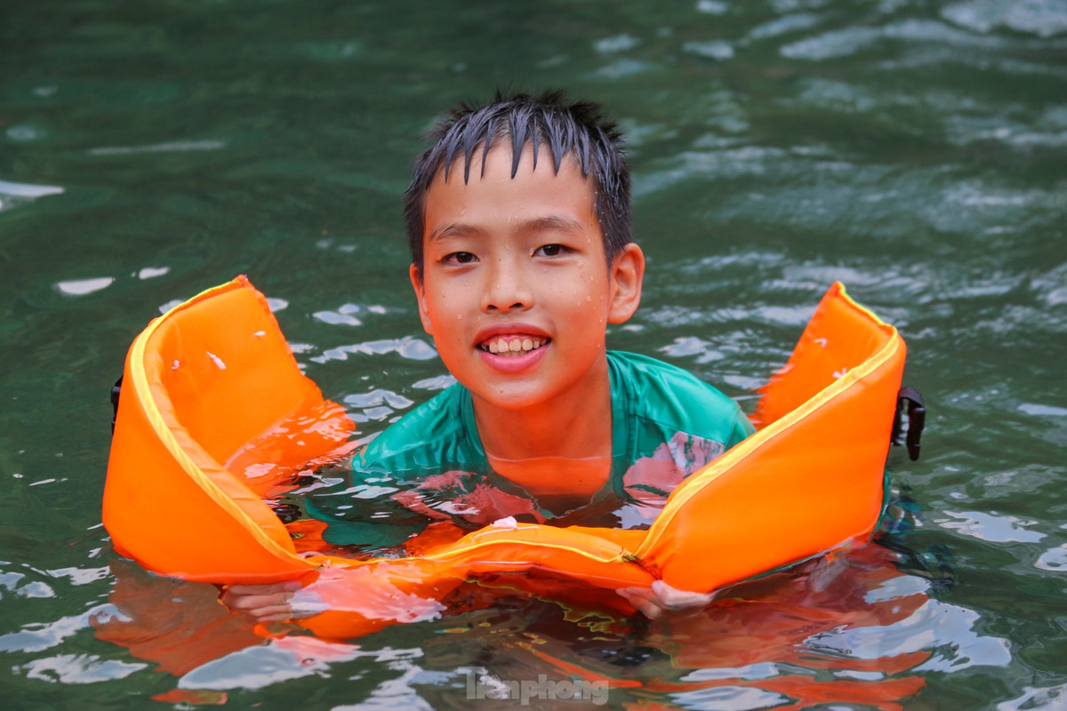 Trẻ nhỏ thích thú vui đùa, hòa mình vào dòng nước trong vắt.