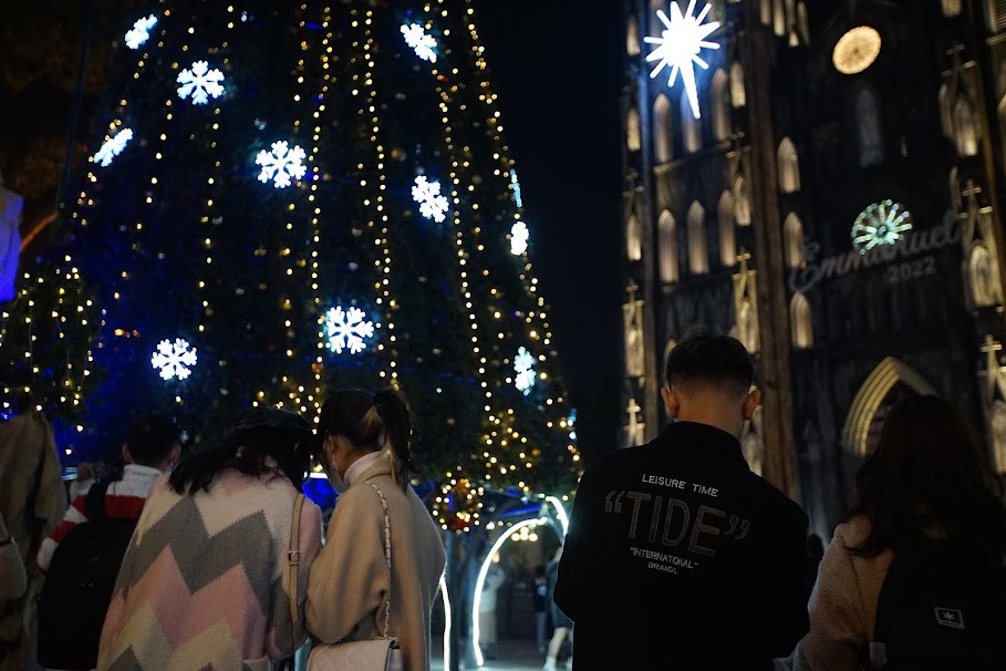 Ánh sáng trang trí trên cây thông tạo thành một hậu cảnh lung linh để các bạn trẻ chụp ảnh check-in dịp Noel này.
