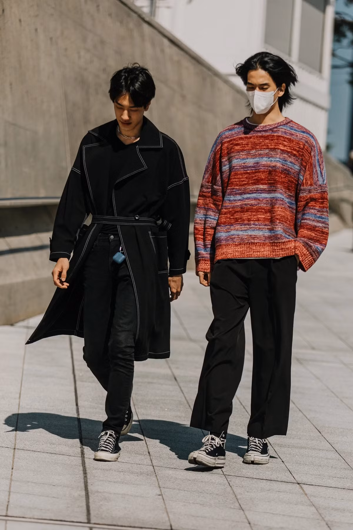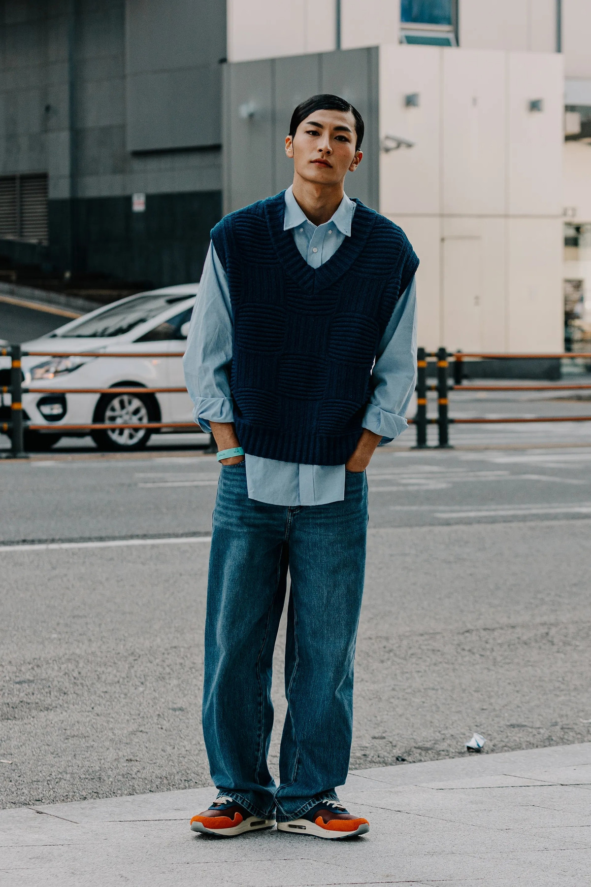 Nam giới đặc biệt ưa chuộng các mẫu quần ống rộng. Ngoài ra, nhiều người mặc áo sweater oversized. Sneakers trở thành một phần không thể thiếu trong thời trang đường phố của giới trẻ Hàn Quốc. Ảnh: Vogue.