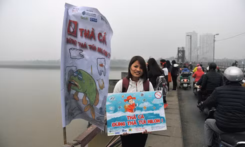 Không chỉ có những băng rôn, khẩu hiệu kêu gọi mọi người có ý thức chung với môi trường mà chính các bạn trẻ từ nhóm tình nguyện đã tự tay cải tạo lại môi trường bằng cách thu nhặt những túi ni lông của người dân ngay sau khi họ phóng sinh. Ảnh: Minh Tuấn