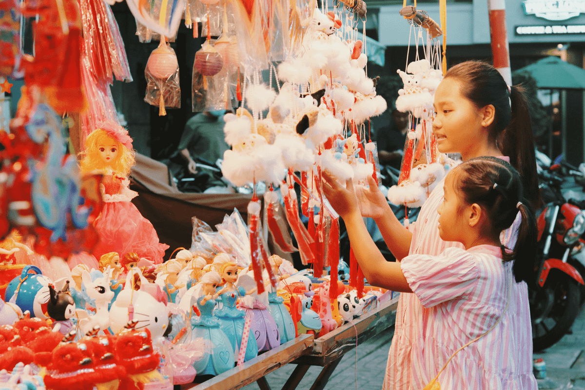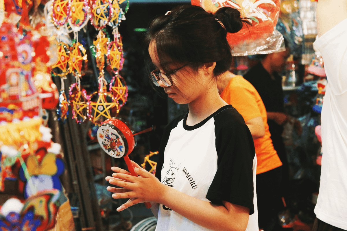 Các em nhỏ xúng xính váy áo được ba mẹ dắt đến để tự tay lựa chọn những chiếc lồng đèn ưng ý.