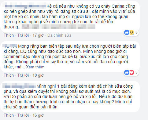 Tuy vậy, việc làm "chữa cháy" của biên biên tập Fanpage này chưa làm nguôi cơn giận của cư dân mạng. Nhiều ý kiến bày tỏ sự bức xúc cho rằng: "Kể cả nếu như không có vụ cháy Carina cũng không nên ghép ảnh như vậy rồi đăng status cứu ai. Đặt mình vào vị trí của một bé không được nhiều fan hâm mộ đi, người lớn có thể không quan tâm người khác nghĩ gì về mình nhưng trẻ con thì rất dễ tổn thương".