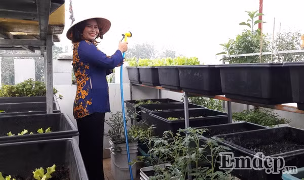 Những vị khách đến thăm gia đình chị Thương không chỉ trầm trồ về sân vườn đẹp mắt mà còn ngỡ ngàng với vườn rau trên sân thượng xanh mướt mà hai vợ chồng chị tự tay chăm sóc.