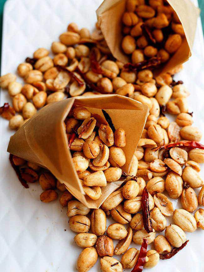 - Cho một ít dầu vào chảo, thêm ớt khô, tiêu Tứ Xuyên (không có cũng được) vào đảo cho thơm. Cho lạc vào, thêm muối, ngũ vị hương, tiêu, đường, tiêu trắng, rang đều cho gia vị ngấm đều vào lạc là được.