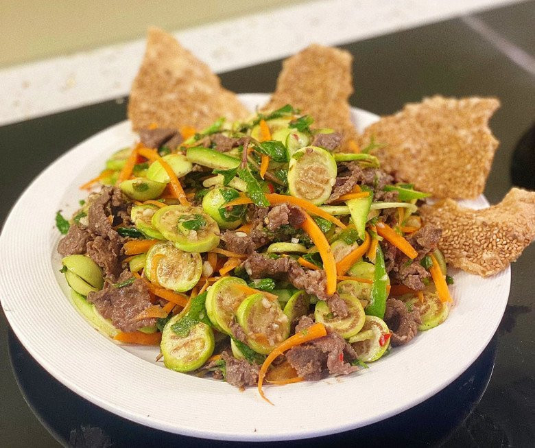 Khi ăn, bạn có thể thưởng thức kèm bánh đa hoặc phồng tôm đều rất ngon! Cà pháo giòn giòn quyện lẫn với thịt bò đậm đà, thơm ngon, có vị chua cay mặn ngọt vô cùng hấp dẫn.