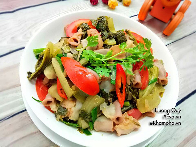 Vẫn cái chảo ấy cho 1 thìa dầu vào đun nóng rồi cho hành, tỏi băm vào phi thơm sau đó cho cà chua vào xào cho chín mềm mới cho dưa chua vào xào cho dưa chín. Cho thêm chút bột nêm rồi đổ đĩa lòng non vào xào cùng dưa khoảng 1 phút rồi nêm lại gia vị cho vừa ăn.