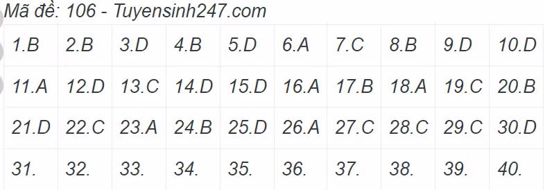 Gợi ý đáp án môn Toán của một số mã đề.