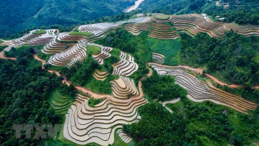Những khoanh ruộng bậc thang được đổ đầy ắp nước như những tấm gương phản chiếu đất trời. (Ảnh: Nam Thái/TTXVN)