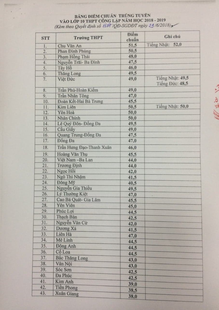 Cụ thể mức điểm chuẩn vào lớp 10 các trường THPT công lập trên địa bàn Hà Nội năm học 2018-2019 như sau: