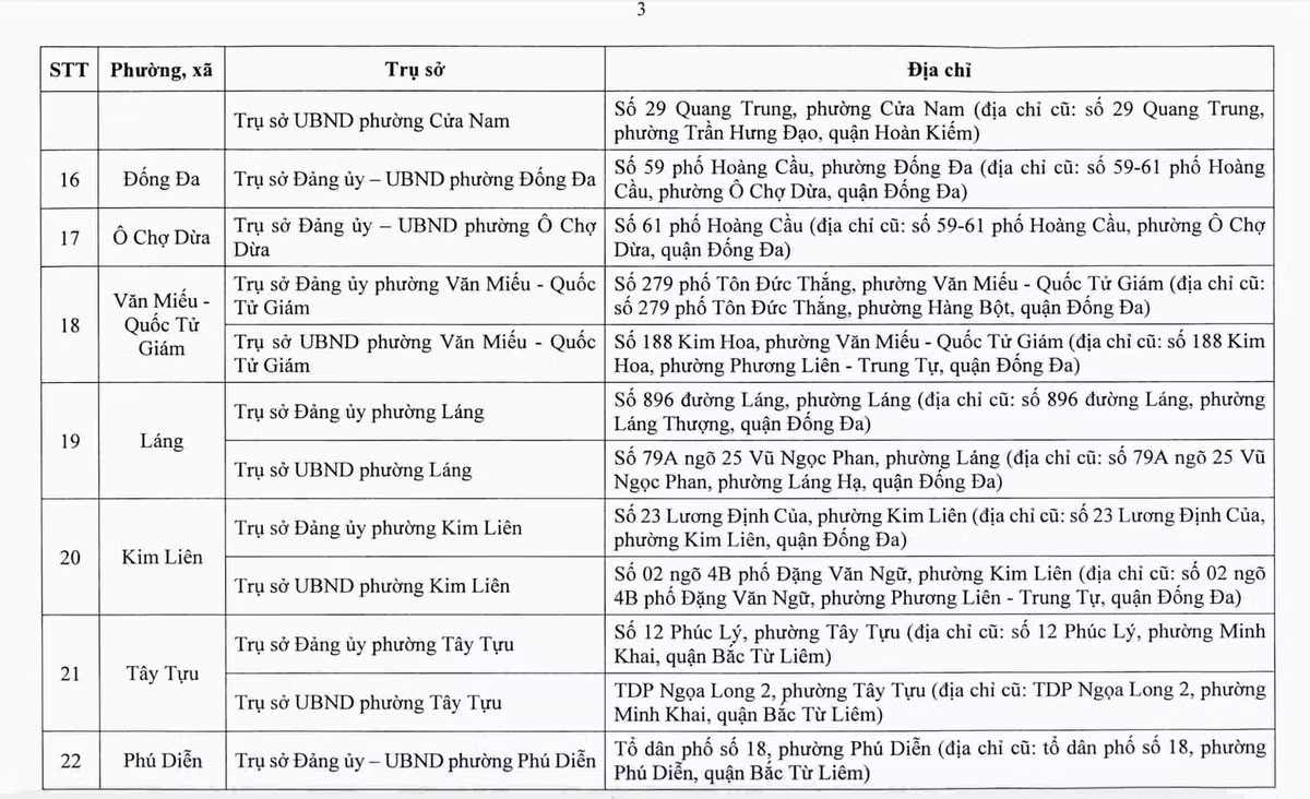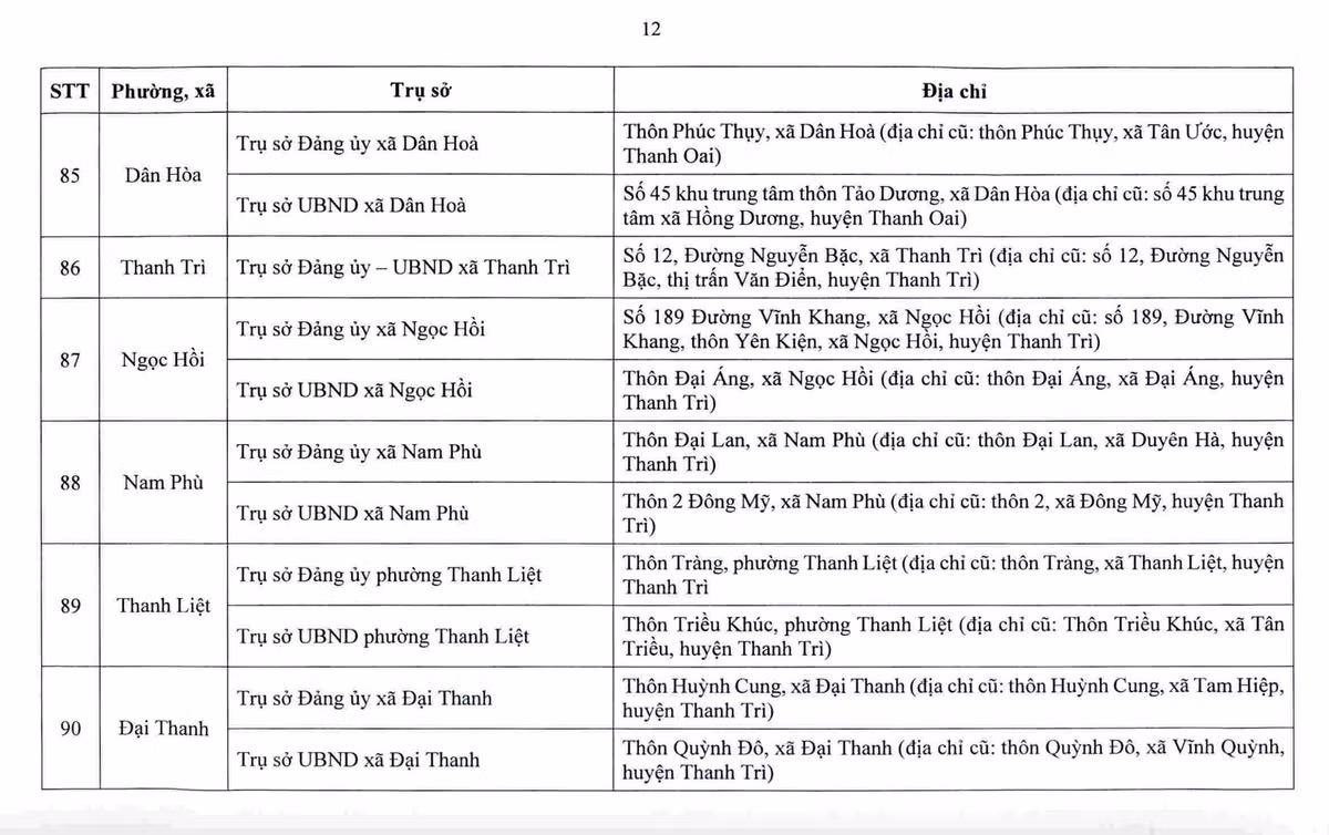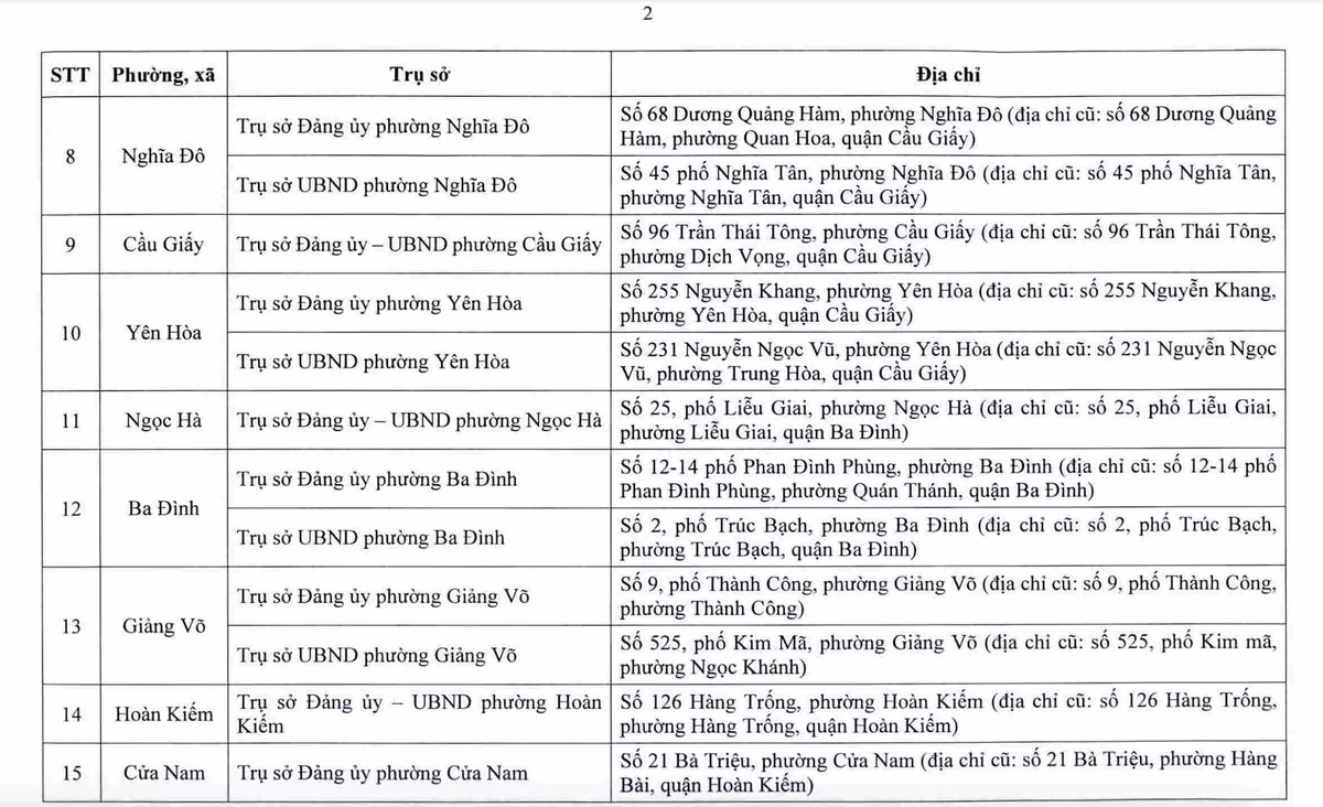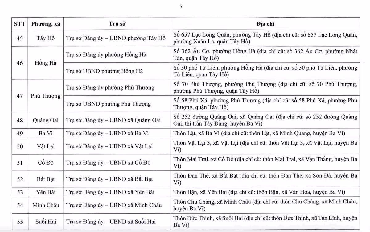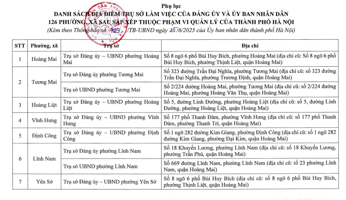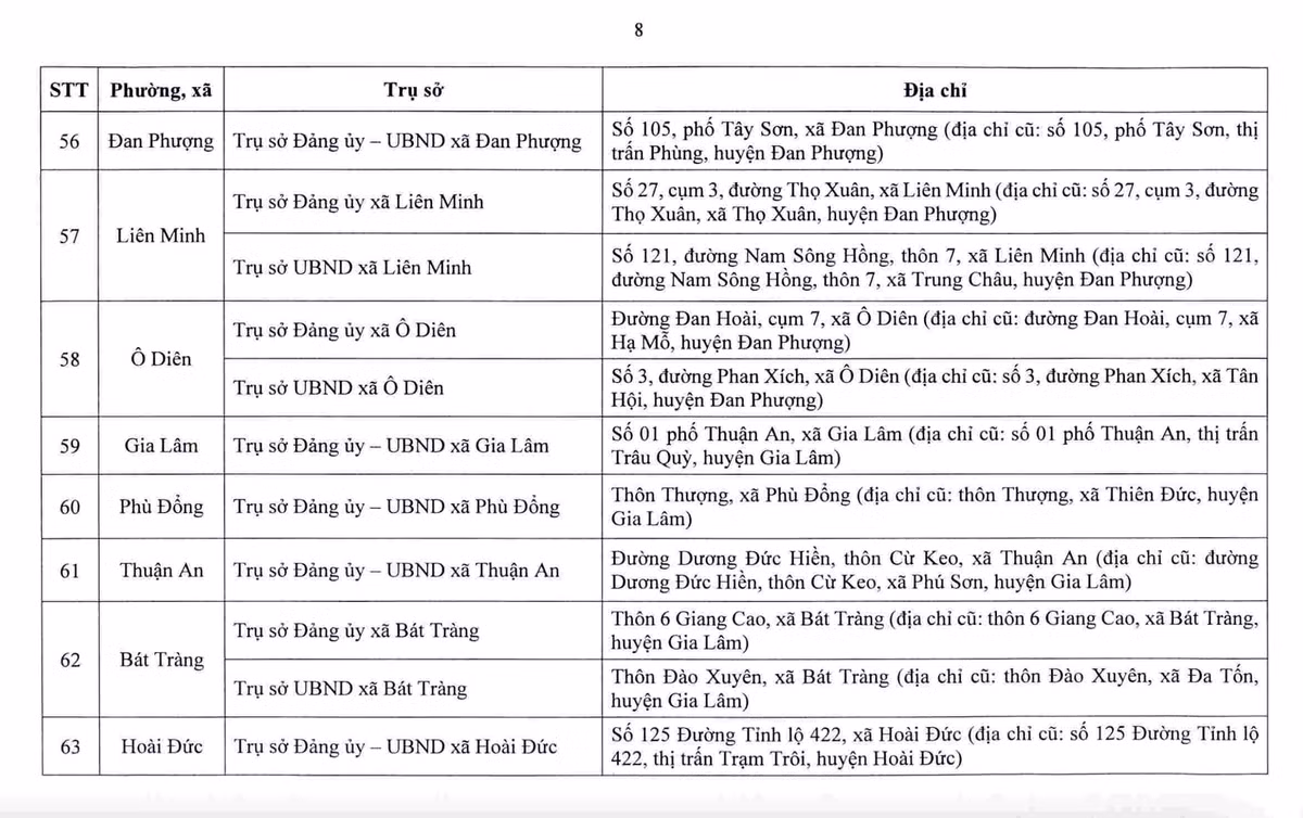Sở Tài chính Hà Nội cho biết, sau sắp xếp, thành phố bố trí 232 cơ sở nhà, đất để làm trụ sở cho 126 xã, phường mới. Danh sách địa điểm trụ sở được công bố nhằm giúp người dân và tổ chức nắm rõ, phục vụ việc giải quyết thủ tục hành chính từ ngày 1.7.2025.