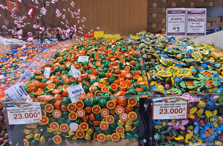 Tại một siêu thị khác trên địa bàn quận Hà Đông, TP Hà Nội, các loại kẹo cân cũng được bày bán phong phú dịp Tết Nguyên đán Nhâm Dần 2022.