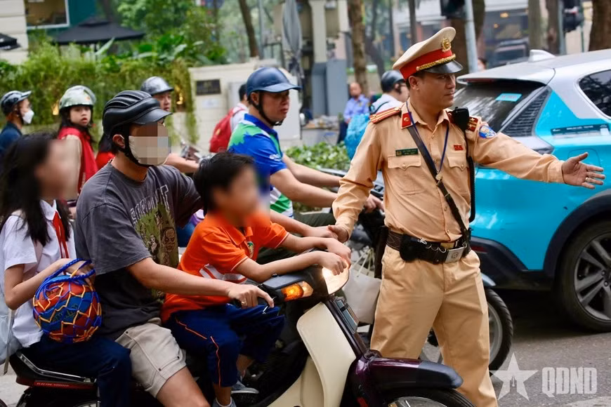 Trong khung giờ cao điểm buổi sáng, tổ công tác Đội Cảnh sát giao thông (CSGT) đường bộ số 1 (Công an TP Hà Nội) đã phát hiện, xử lý hàng chục phụ huynh chở con trên xe máy nhưng không đội mũ bảo hiểm cho trẻ.