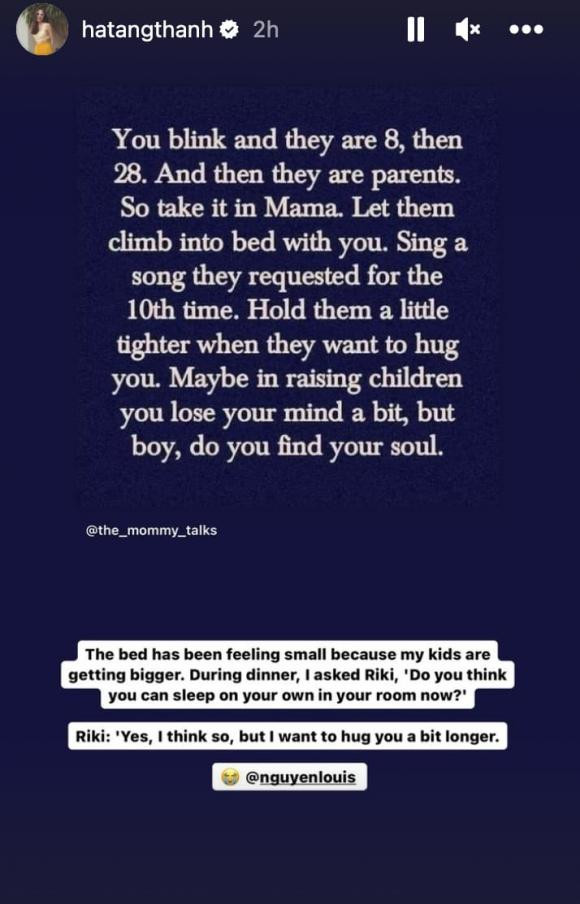 Mới đây, trên Instagram cá nhân của mình, Hà Tăng đã đăng tải dòng trạng thái gây chú ý. Cô hiếm hoi đề cập đến quý tử đầu lòng là bé Richard. Nhóc tì nay đã 9 tuổi và cao lớn hơn trước nhiều nên cô đang có ý định đổi chiếc giường cũ để quý tử thoải mái hơn. Dù vóc dáng có khác nhưng tính cách của nhóc tì vẫn giữ nguyên một điều khiến bà mẹ nổi tiếng xúc động.