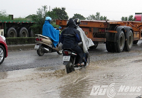 Trong cơn mưa tầm tã cuối giờ chiều, nhiều người tham gia giao thông phải gồng mình song hành với "hung thần" đất Cảng trên "con đường tử thần" tại Hải Phòng này.