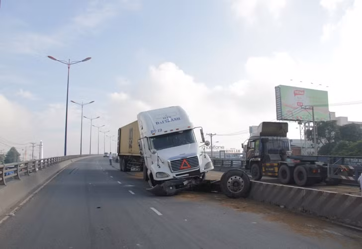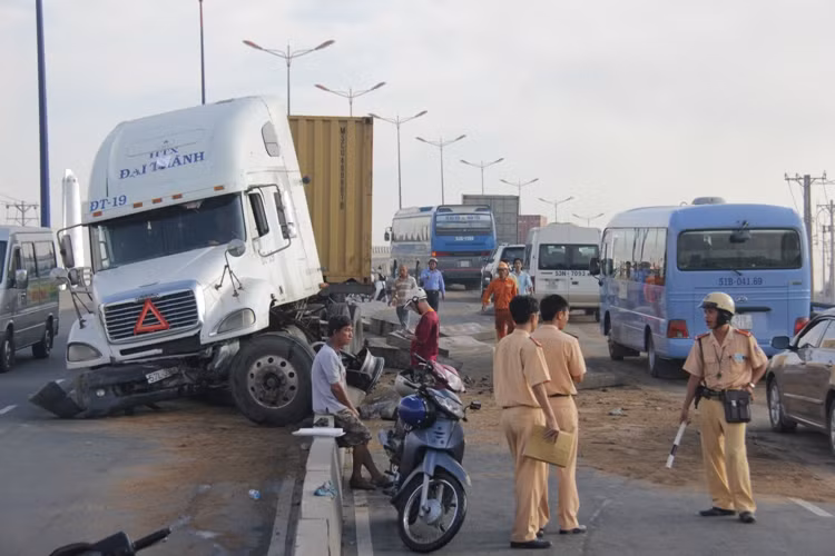 | Hiện trường xe đầu kéo gây náo loạn trên cầu vượt thép Thủ Đức. |