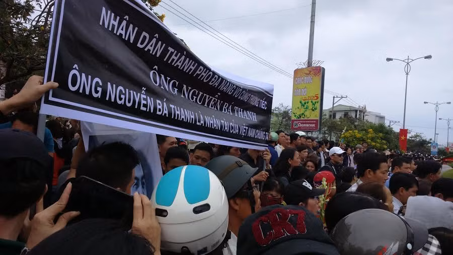 Ghi nhận của Kiến Thức, cuối giờ sáng nay (18/2), trên đường di quan, nhiều người giương cao hình ảnh ông Nguyễn Bá Thanh cùng tấm băng rôn với dòng chữ: "Nhân dân TP Đà Nẵng vô cùng thương tiếc ông Nguyễn Bá Thanh. Ông Nguyễn Bá Thanh là nhân tài của Việt Nam chúng ta” và hô vang tên ông bằng tất cả lòng kính trọng.