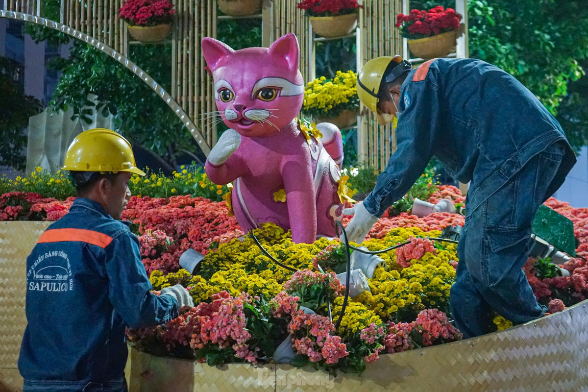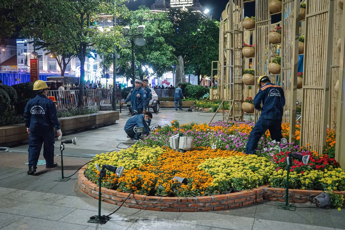 Phía bên trong đường hoa có gần 500 công nhân của công ty điện lực, công ty cây xanh chia nhau thành từng nhóm nhỏ dọn dẹp các tiểu cảnh.