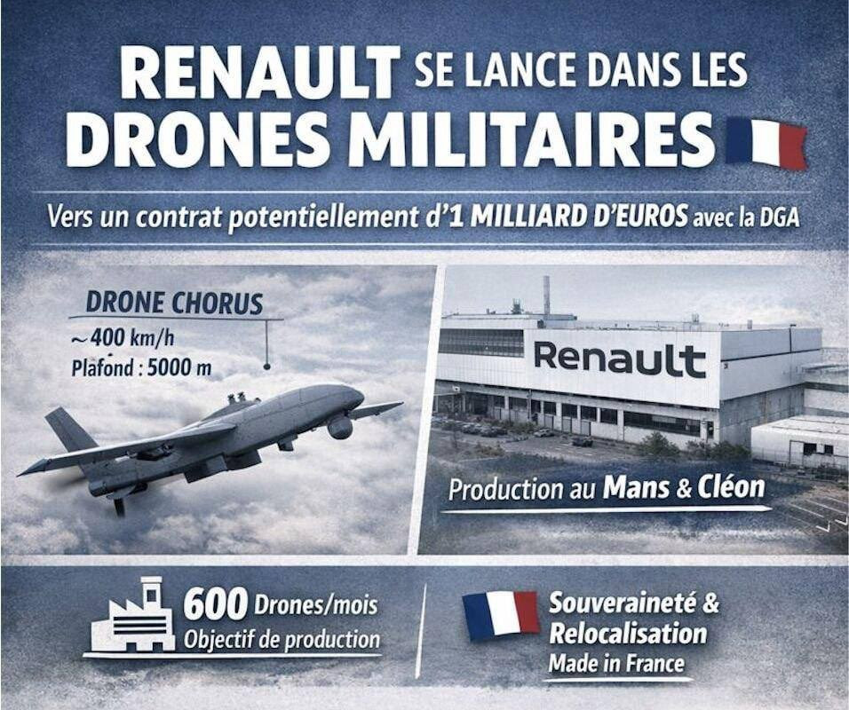 Renault đã xác nhận kế hoạch sau khi xuất bản thương mại của Pháp Nhà máy mới Nhà sản xuất ô tô sẽ sản xuất máy bay không người lái tại các nhà máy của mình ở Le Mans và Cléon, phía tây Paris, trong một hợp đồng có thể trị giá tới 1 tỷ euro (1,2 tỷ USD) trong 10 năm. Renault từ chối xác nhận chi tiết về địa điểm sản xuất và giá trị của hợp đồng.