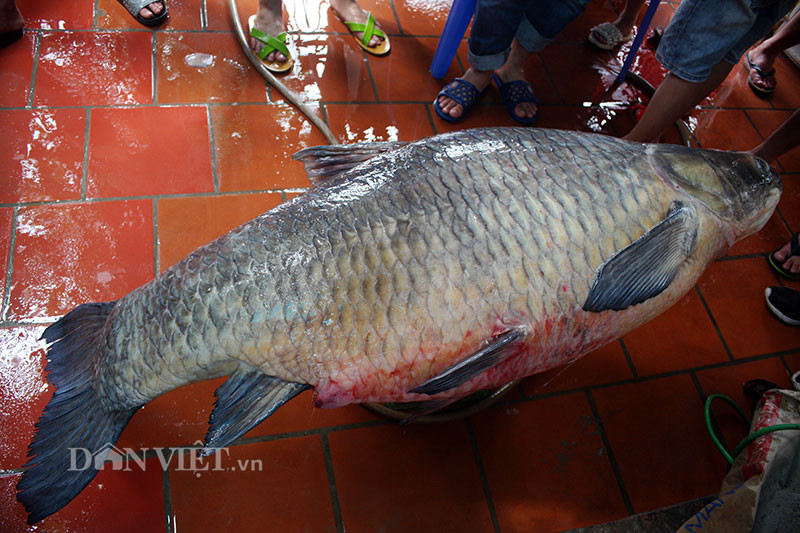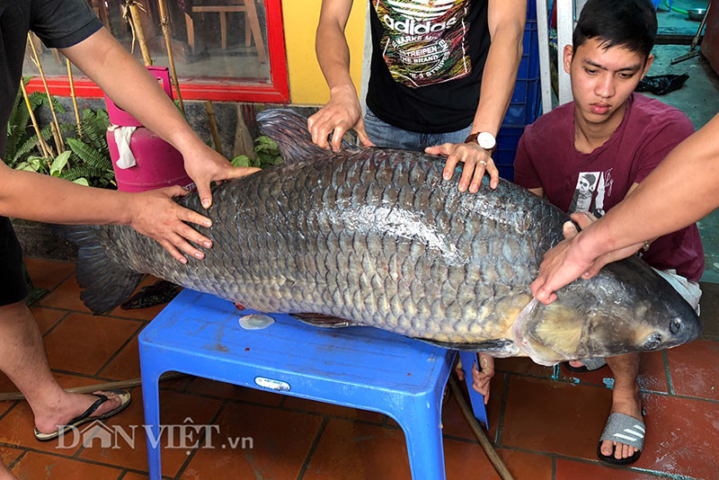 Được biết, đây chính là con cá trắm đen mới đánh lưới được bởi một nhóm ngư dân ở huyện Yên Bình (khu vực hồ Thác Bà, Yên Bái).
