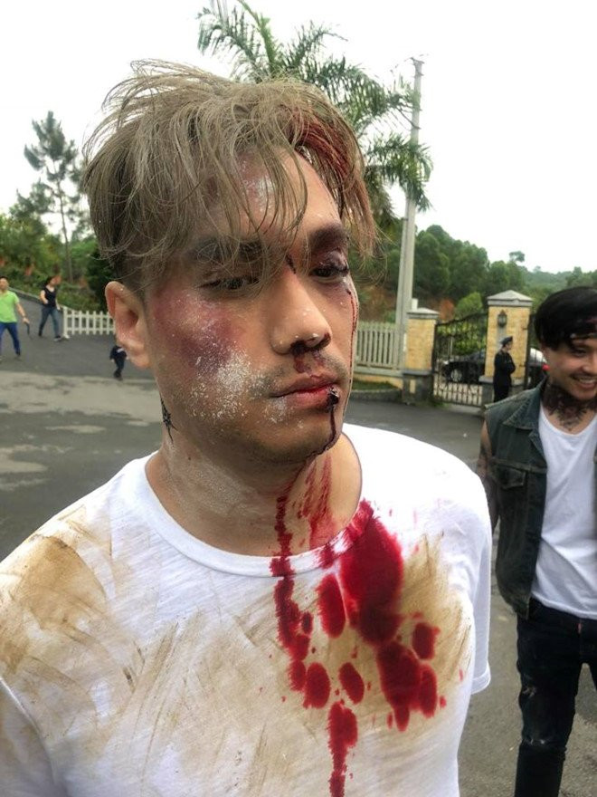 Một số hình ảnh phía sau ống kính cho thấy, nam diễn viên có cảnh đánh nhau tới bầm dập mặt mũi.