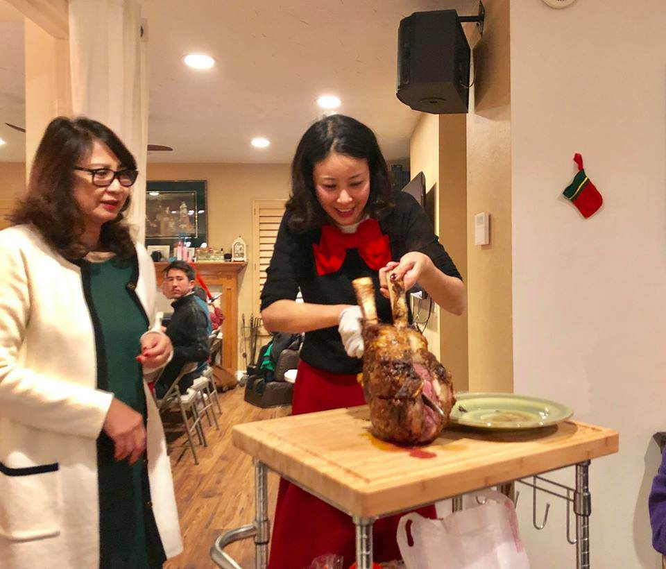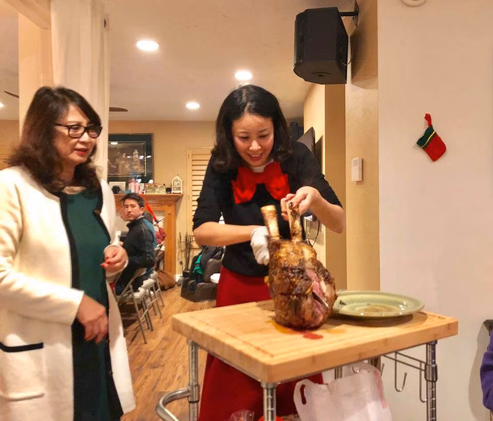 Gia đình và bạn bè hoa hậu quây quần, cùng tổ chức tiệc ấm cúng trong nhà.