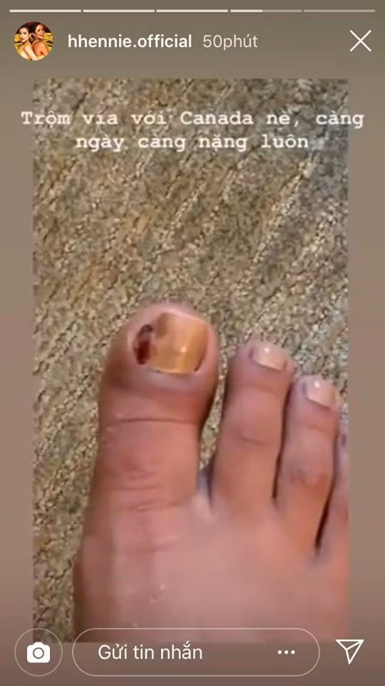 Cô chia sẻ trên trang cá nhân: "Thiệc là đau và nhức, đang lo sắp tới có 1 đôi giày bịt mũi rất đẹp và phải mang nhưng tình hình thế này thì khó quá".