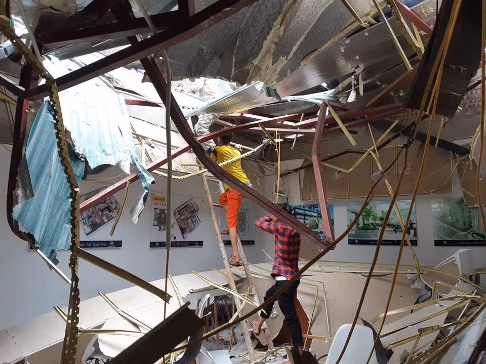Thời điểm PV Kiến Thức ghi nhận, trong khu nhà văn phòng ở công trình The Sun vẫn ngổn ngang các vật liệu bị rơi từ trên cao xuống, mái nhà bị thủng rất lớn.