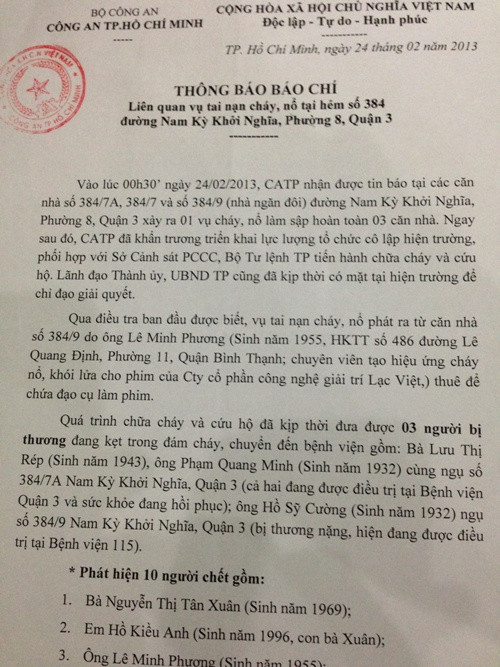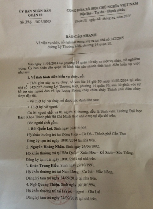 | Vụ nổ tại nhà trọ của các sinh viên trường ĐH Bách khoa TPHCM trên đường Lý Thường Kiệt, phường 14, quận 10 làm 4 người chết thảm. |