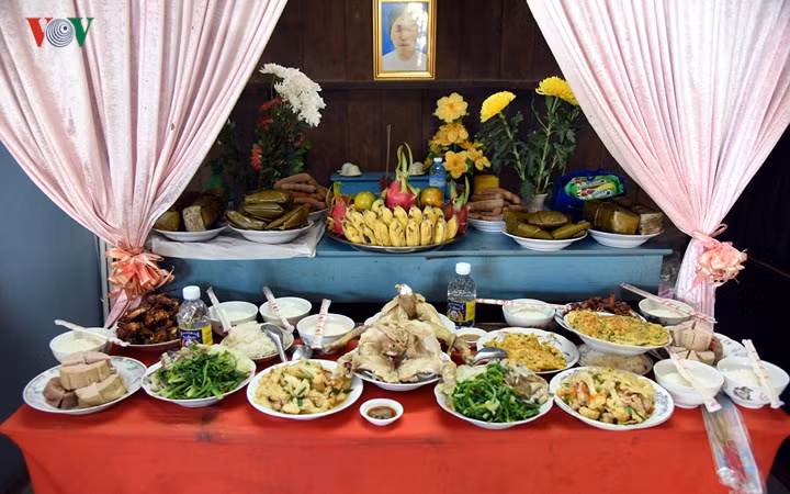 Anh Vĩnh - cháu cụ Hồng chuẩn bị mâm cơm trước bàn thờ gia tiên.