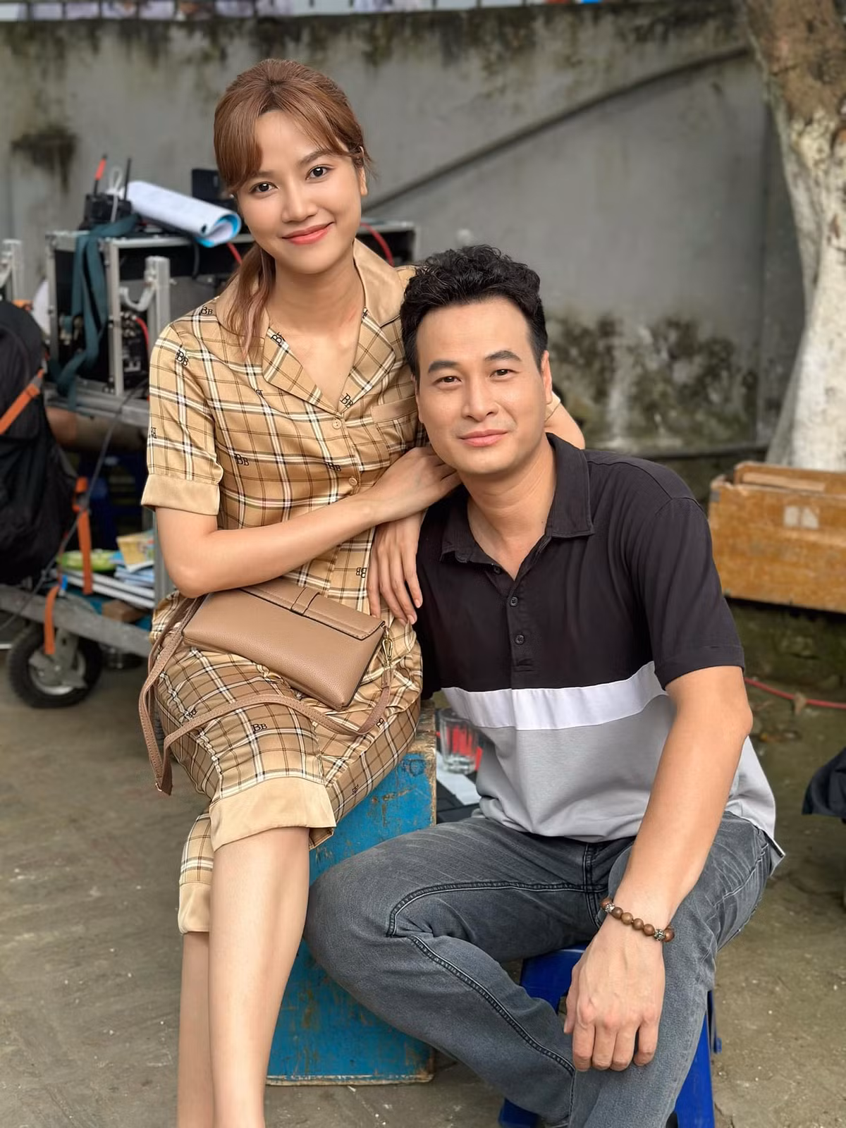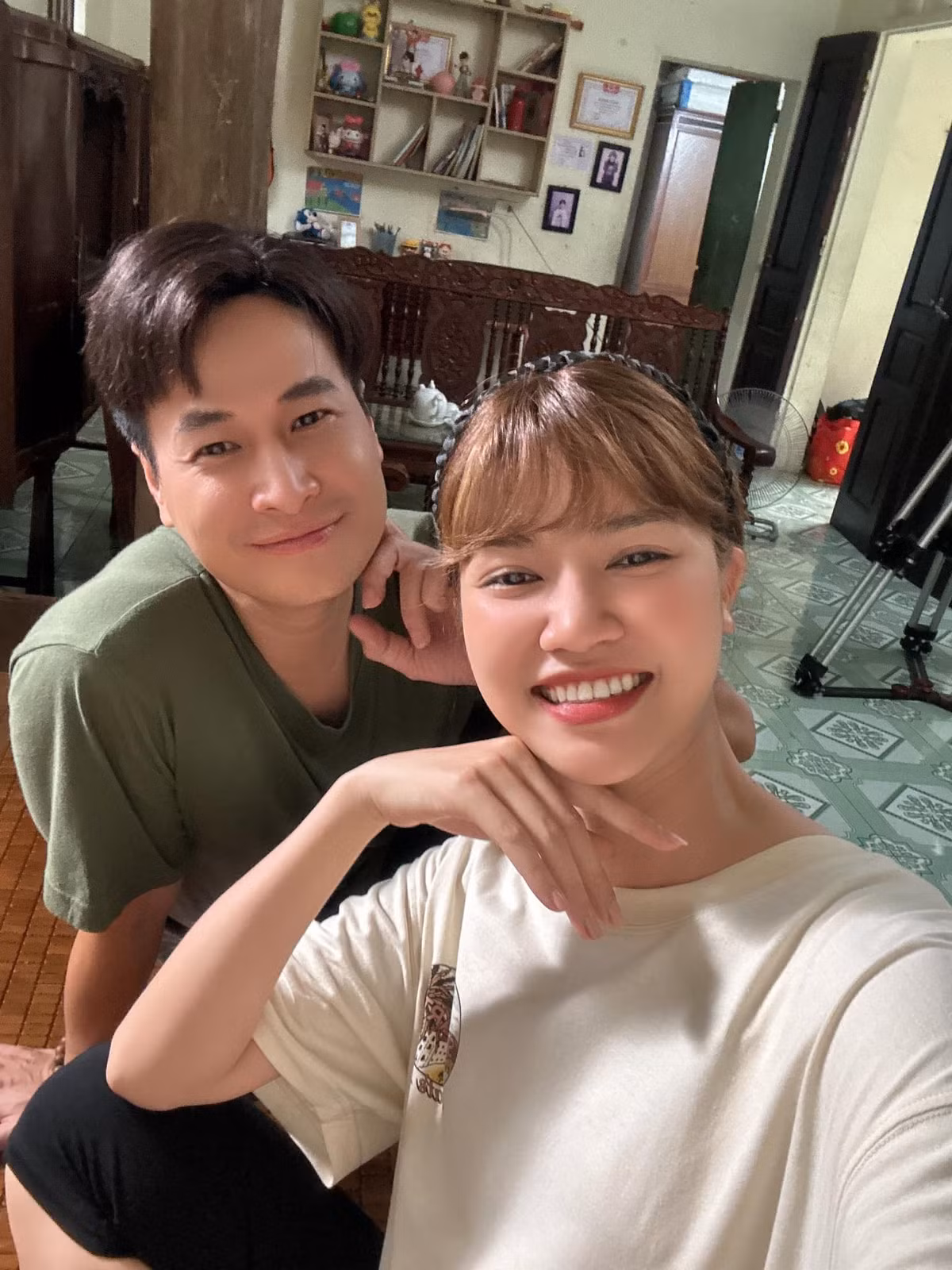 Nhân vật Thanh Thu (Anh Đào) - vợ Tiến trong phim luôn quát mắng chồng. Tuy nhiên, ở hậu trường, cả hai rất vui vẻ.