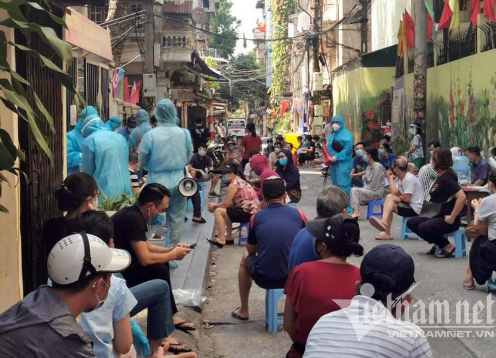 Hình ảnh từ bên trong nơi cách ly y tế phường Chương Dương quận Hoàn Kiếm. Ngày 31/7, các lực lượng tiến hành test nhanh Covid-19 và tiêm vắc xin cho người dân khi trước đó khu vực này có ca nhiễm Covid-19.