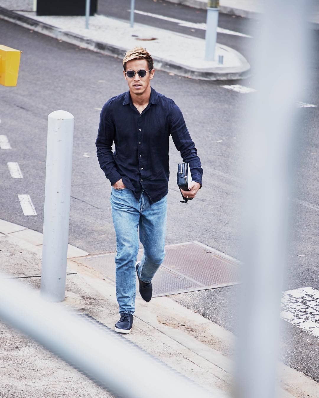 Thay vì mặc quần short như trận trước, Keisuke Honda mặc một chiếc áo polo hàng hiệu nổi bật với tông màu hồng xanh lạ lẫm phối cùng quần ống loe màu xanh dương và đôi giày lười màu cam.