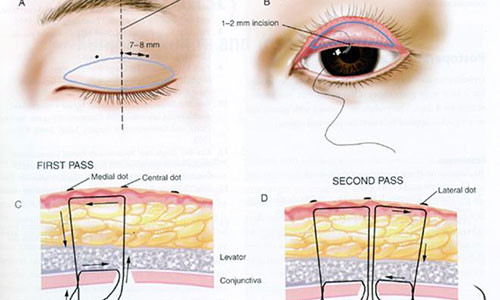 Bác sĩ sẽ xác định điểm để luồn chỉ (khoảng từ 3-5 điểm) tại mi mắt trên, từ các điểm đó sẽ luồn chỉ sinh học xuống sát sụn của mi mắt trên và cố định với sát lớp dưới da mi để tạo thành nếp mí.