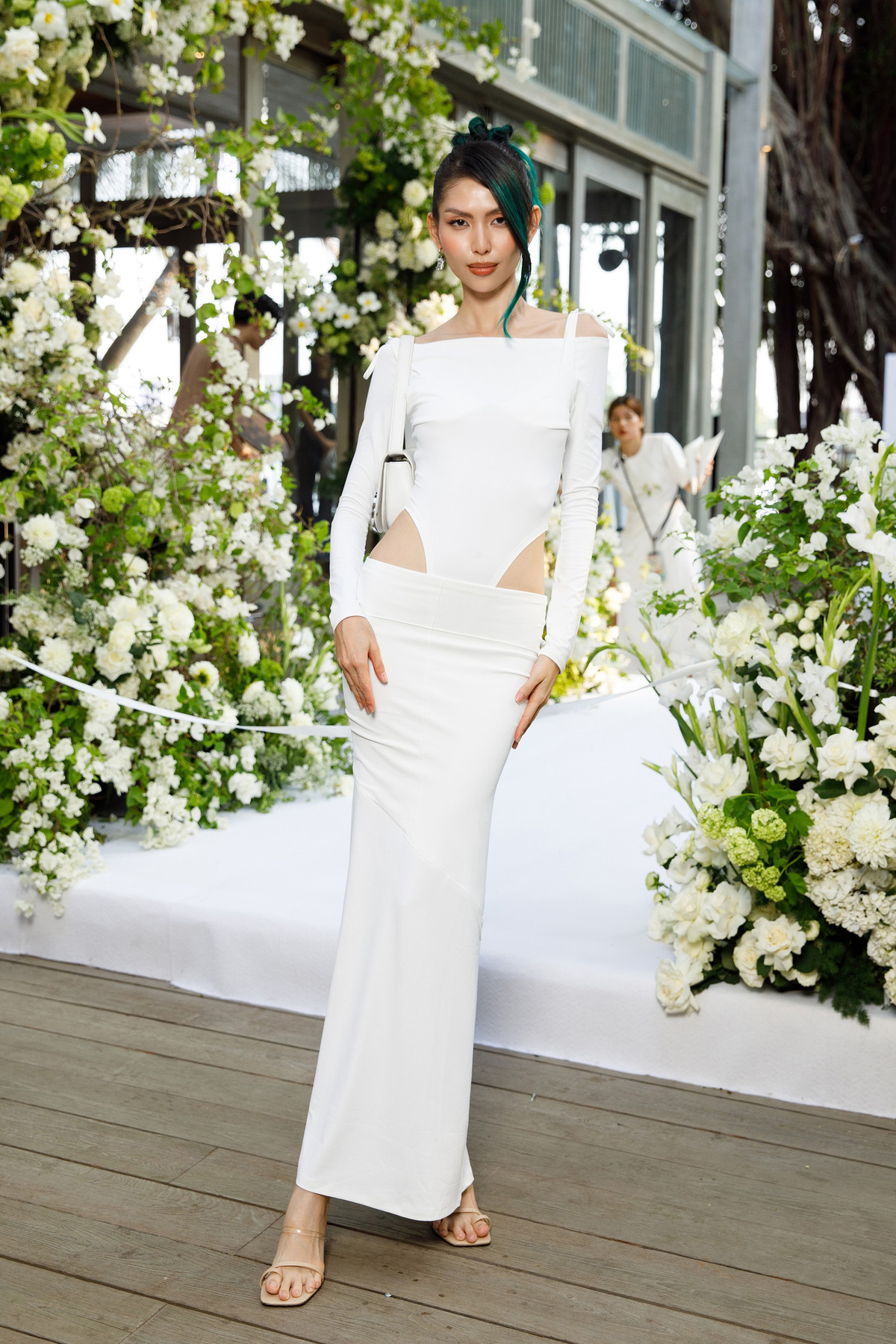 Người mẫu Thùy Dương diện váy trắng cut-out dự tiệc cưới. Cô là bạn thân của Cao Thiên Trang từ thời cả hai cùng thi Vietnam's Next Top Model.